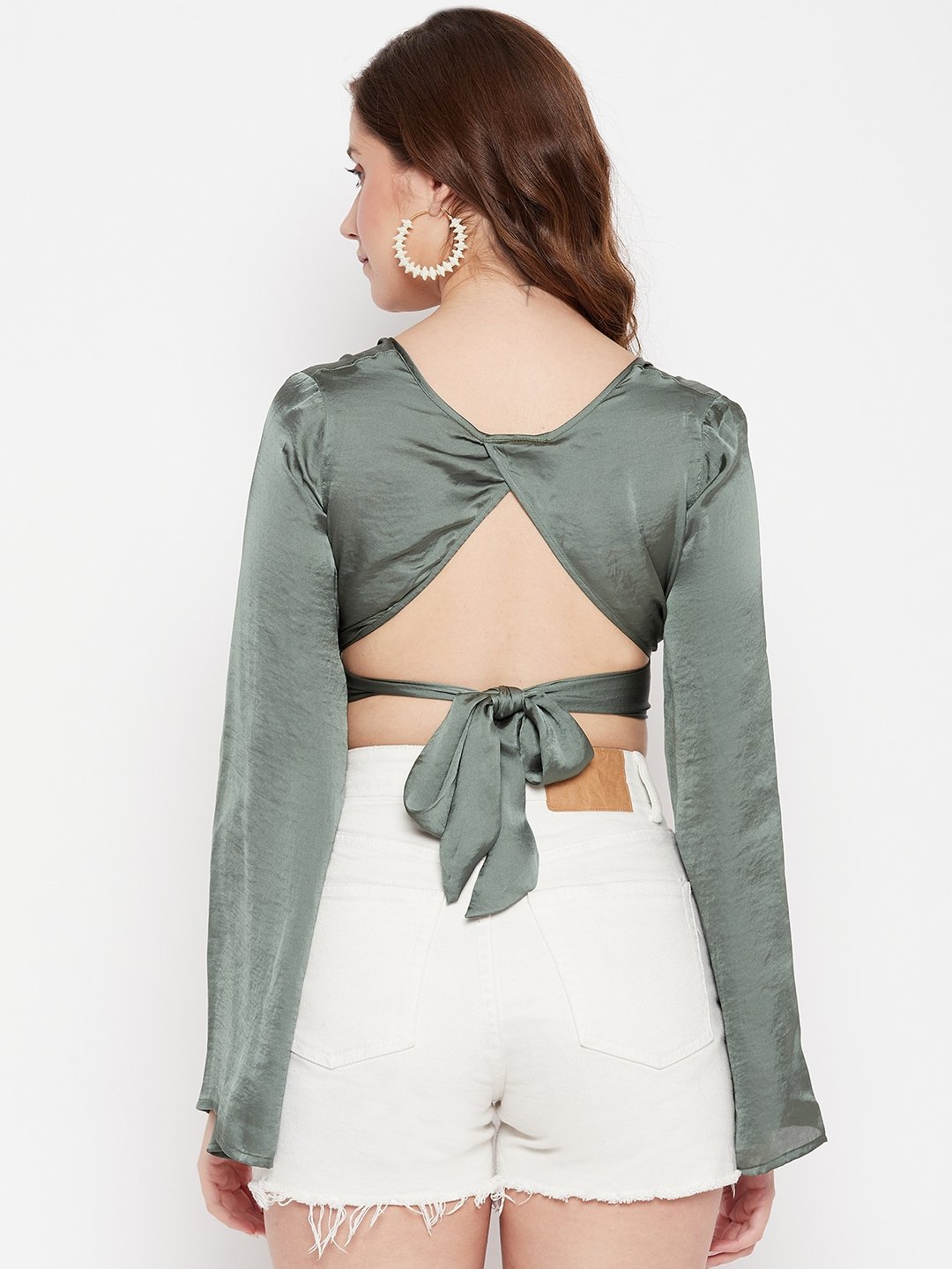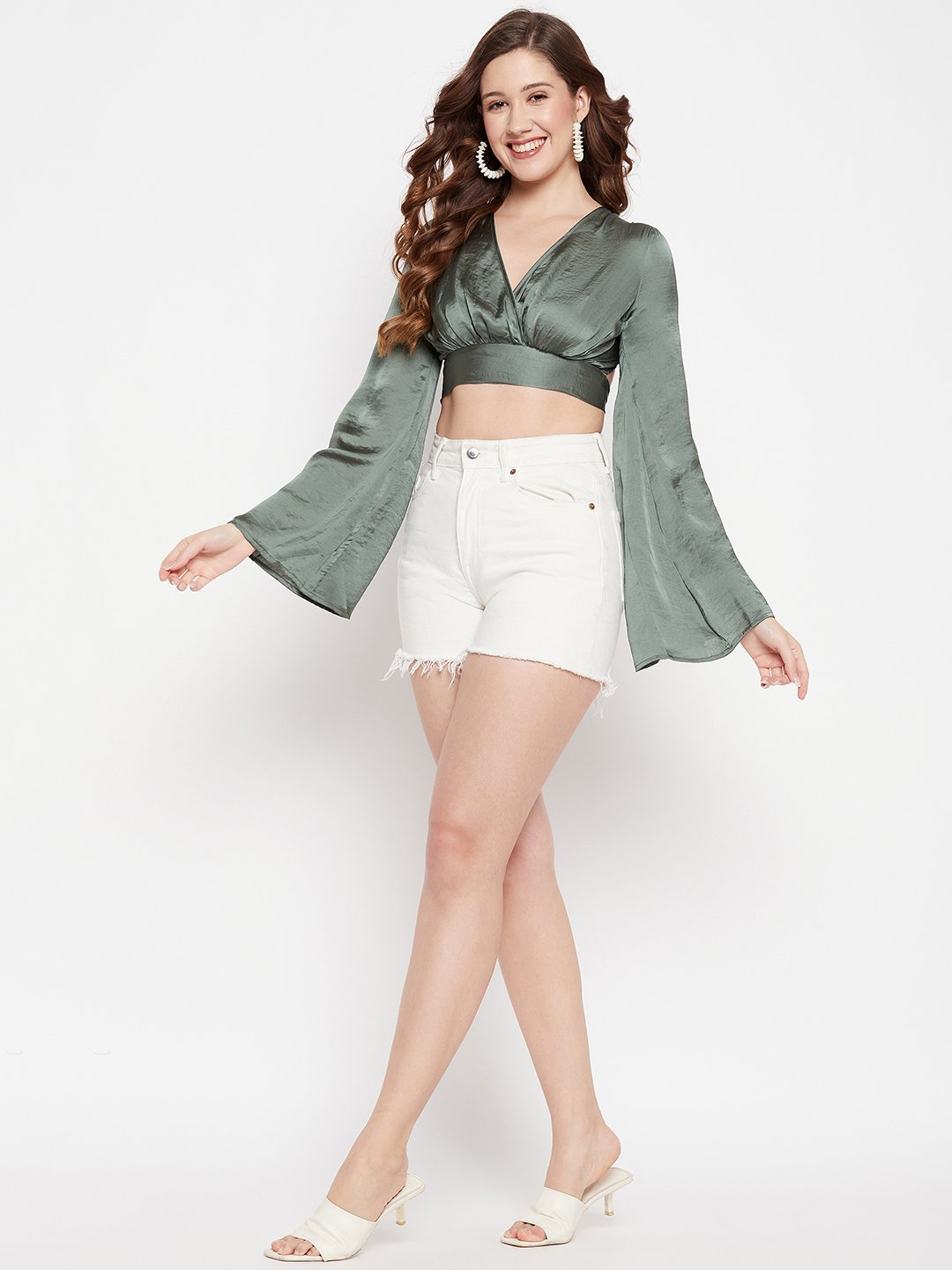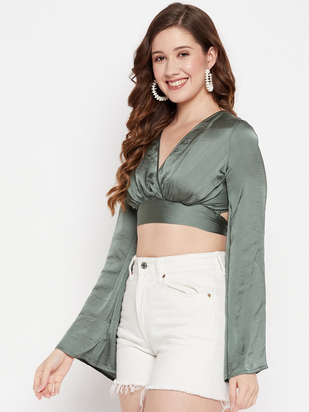 WOVEN SATIN CROP TOP WITH BELL SLEEVE