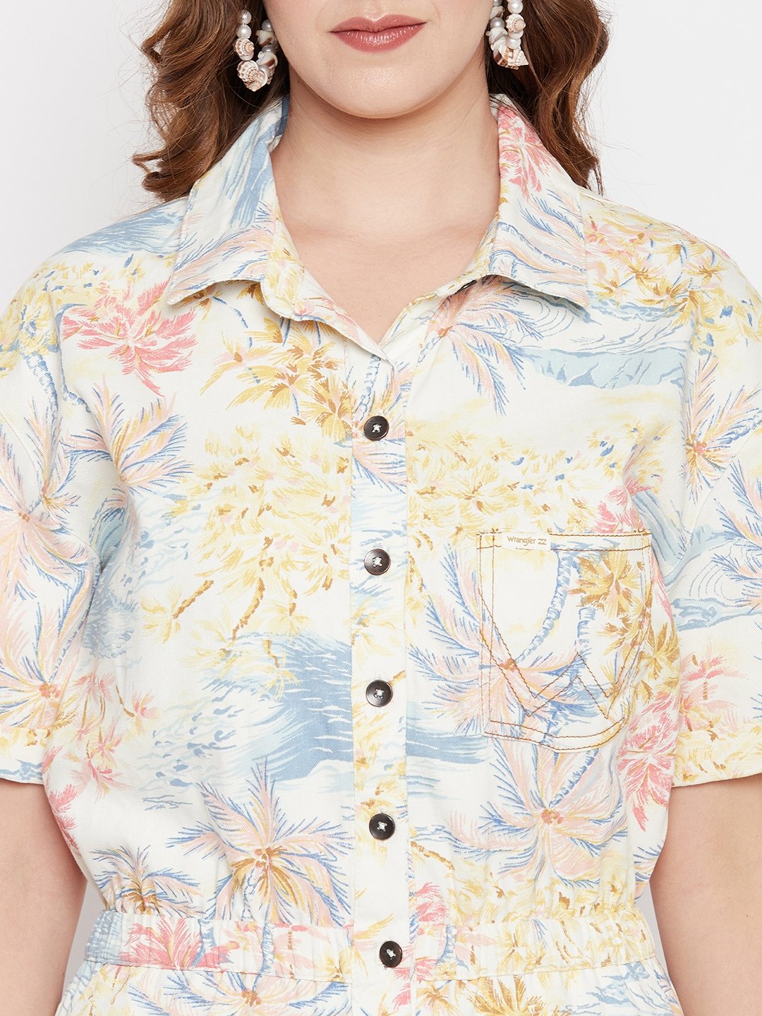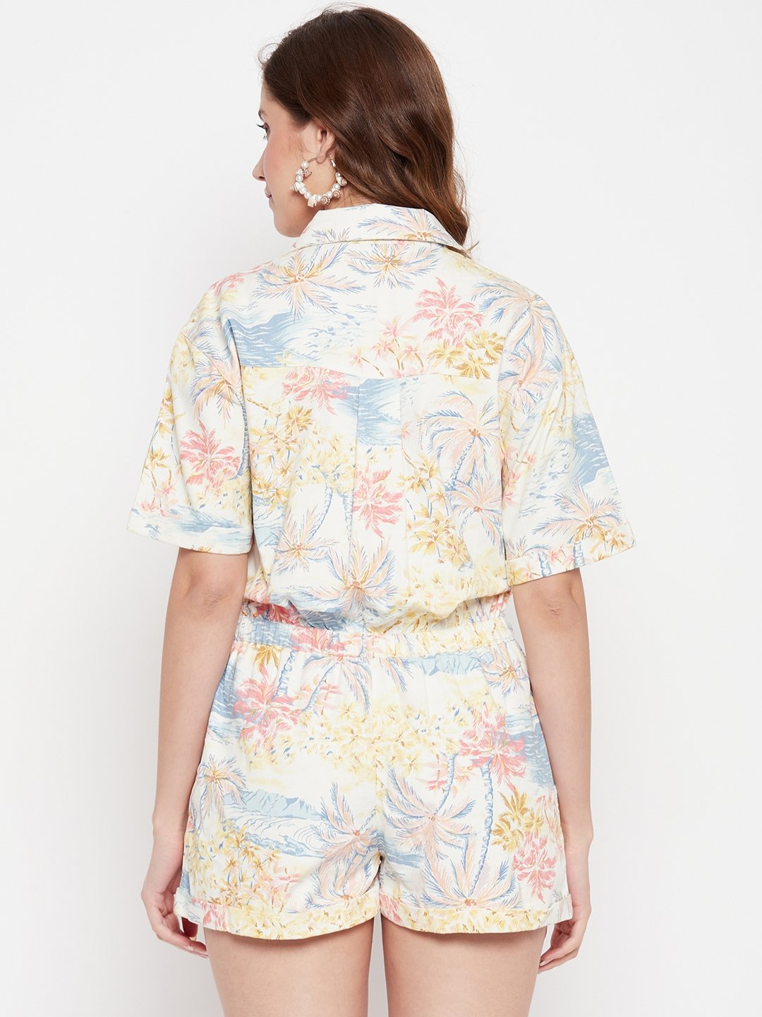 WOVEN TROPICAL MULTI COLOUR PRINT CENTER FRONT OPENING WAIST ELASTIC AND SHORT JUMPSUIT